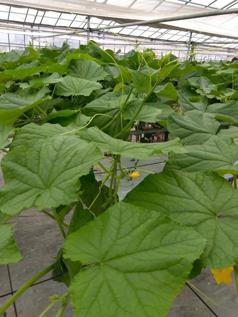 温室の片隅にあるキュウリ(趣味です)はまだ寒くはないようです。葉っぱが大きい!